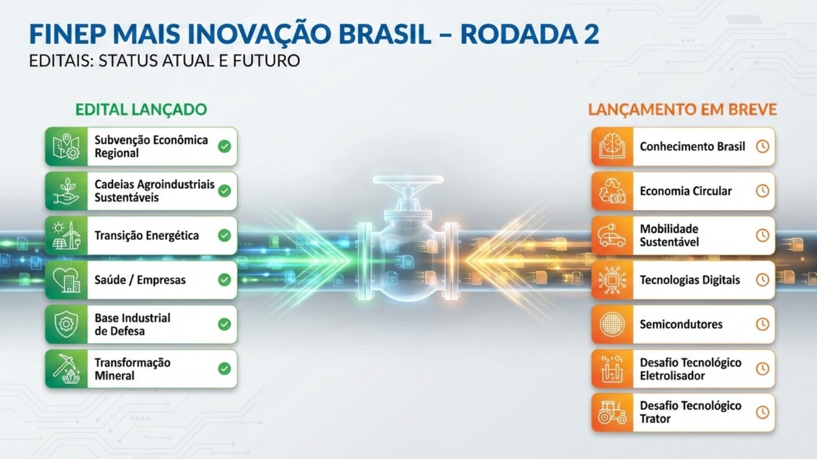Um dos eixos centrais do Finep pelo Brasil é a nova rodada de subvenção econômica anunciada pelo MCTI e pela Finep. São 13 editais, com R$ 3,3 bilhões em recursos não reembolsáveis destinados a empresas brasileiras de todos os portes, em parceria obrigatória com Instituições Científicas, Tecnológicas e de Inovação (ICTs). As propostas podem ser submetidas até 31 de agosto de 2026, pelo site da Finep.