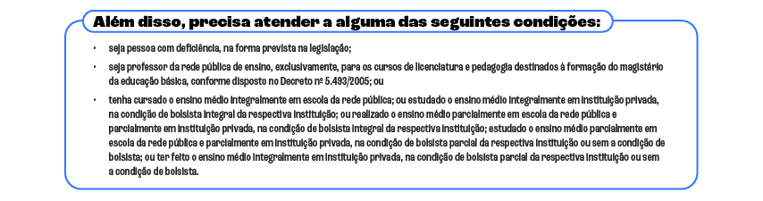 Prouni – criado em 2004, pela Lei nº 11.096/2005, o Programa Universidade Para Todos oferta bolsas de estudo (integrais e parciais) em cursos de graduação e sequenciais de formação específica, em instituições de educação superior privadas. O Programa ocorre duas vezes ao ano e tem como público-alvo o estudante sem diploma de nível superior.
